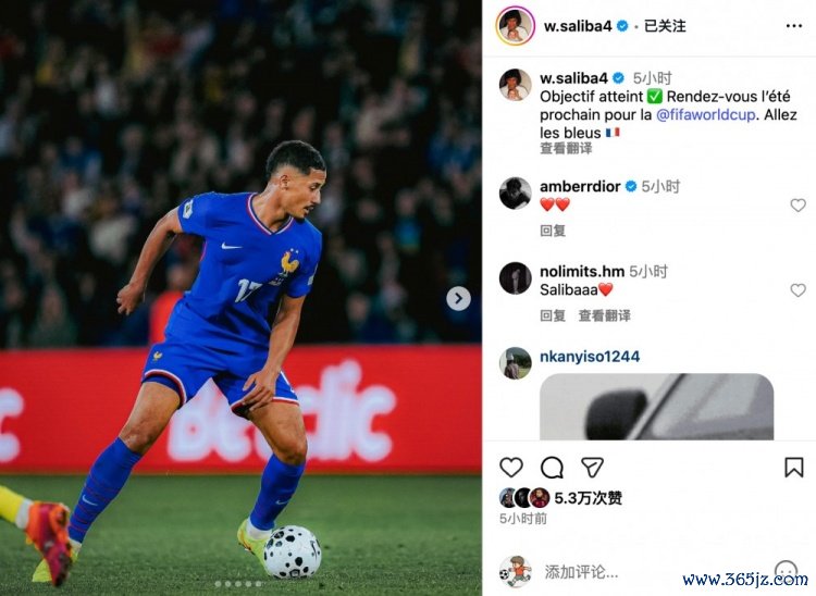 萨利巴社媒:目标达成✅明年夏天世界杯赛 见!助威 ,法国队🇫🇷