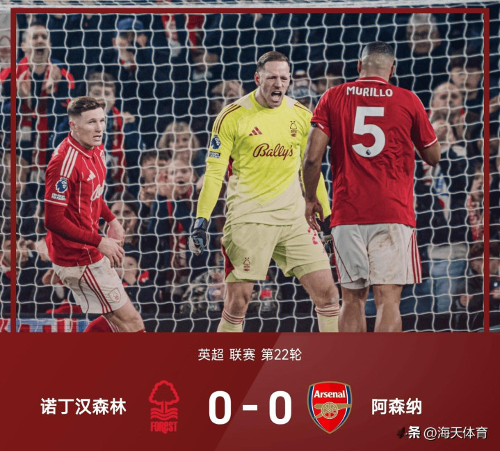 25/26赛季英超职业联赛 第22轮,诺丁汉森林0-0互交白卷闷平阿森纳。上半场奥多伊冲破 在危险区域 线上倒地,主裁判 未判十二码球;哲凯赖什、马丁内利错失破门良机;下半场,萨卡、赖斯连续造险,塞尔斯连续贡献神抢救 主;赛事 最后时刻,埃纳疑似在危险区域 端线 手球运动 ,主裁判 经VAR提醒后依旧未判十二码球。阿森纳遭遇职业联赛 两连平。
