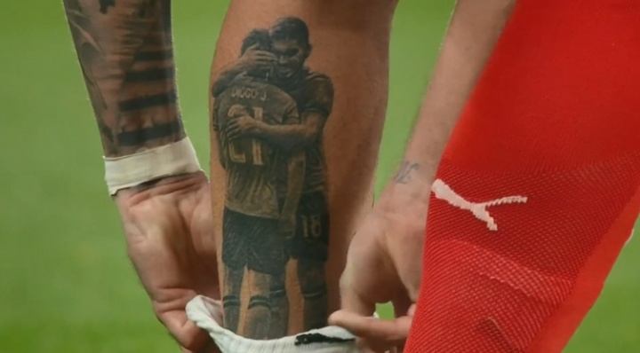 内维斯身着的正是若塔此前的21号运动活动 服 ,并且他还在小腿上文着一个若塔的文身。