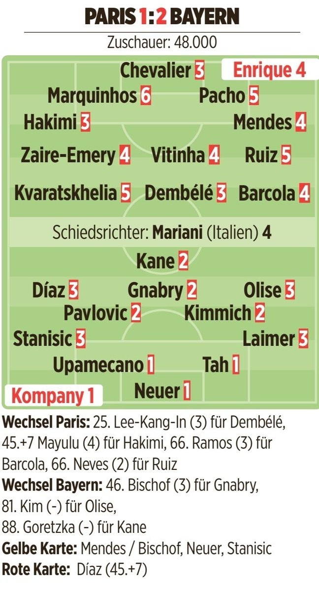 11月5日讯 巴黎在本轮欧冠焦点战主场作战 1-2不敌拜仁,马尔基尼奥斯送礼、迪亚斯双响后染红,《图片报》在赛后为两队进行了评分:(1分最佳、5分最差,6分相当于负分)