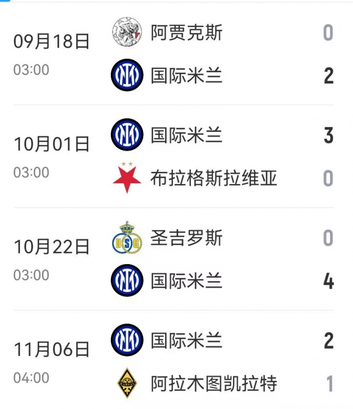 11月06日讯 欧冠第4轮,国米主场作战 2-1战胜凯拉特,本赛季欧冠已豪取4连胜,与拜仁、阿森纳共同成为本赛季欧冠至今唯三的全胜球队。