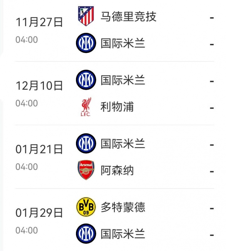 前4场全胜!国米欧冠本阶段剩余对手:马竞、红军、枪手、多特