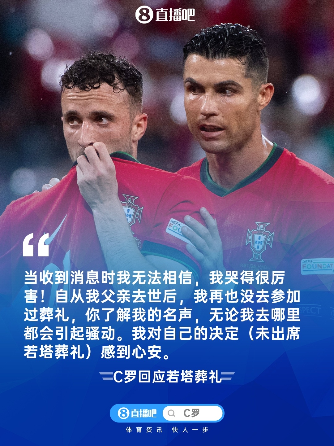 C罗:当时我和乔治娜在健身运动练习 房,我收到消息时我无法相信。我哭得很厉害。这对每个人来说都是非常非常艰难的时刻,对国家、对家庭、对朋友、对队友来说,这是非常非常令人悲伤的消息。