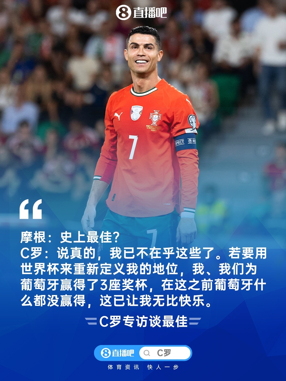 C罗:是的,赢得世界杯赛 不会改变我在古代足球 史上的地位。我不会撒谎,有一件事我很确定,我享受当下,并且我随着时间学到了,"当下"是我们所拥有的最重要的东西。我们葡萄牙队还没获得参赛资格呢。享受当下。
