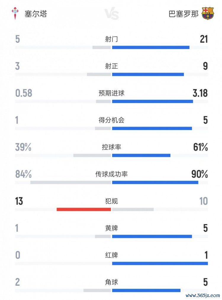 巴萨vs塞尔塔全场数据:射球 21比5、射正9比3、盘带时间 61%比39%