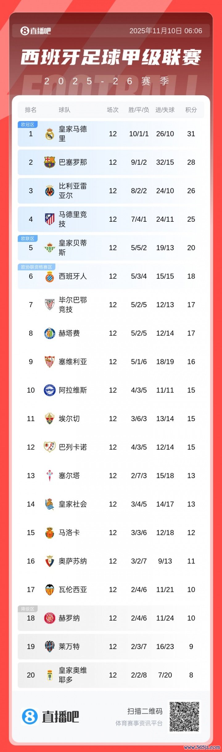 西甲积分榜:皇马本轮闷平3分优势领跑,巴萨28分第二,马竞第四